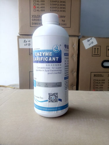 游泳池澄清劑是一種不需要吸污的沉淀劑,液體狀,分別有兩種:泳潔高效酵素澄清劑和泳潔高效澄清劑,規格為1kg/瓶,針對水質渾濁使用,使用這種澄清劑非常簡單只需泳池開啟過濾系統配合一起使用(注至少要4-6小時效果比較顯著),將水中的懸浮物、藻類等其它雜質通過沙缸過濾去除,使水澄清。